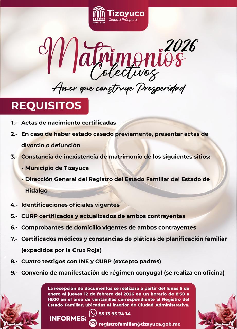 Las parejas interesadas pueden acudir de lunes a viernes, de 9:00 a 16:00 horas, o solicitar información a través de WhatsApp 551 395 7414 y el correo registrofamiliar@tizayuca.gob.mx. Con esta campaña, el Gobierno Municipal reafirma su apuesta por políticas públicas cercanas, humanas y enfocadas en la unidad familiar.